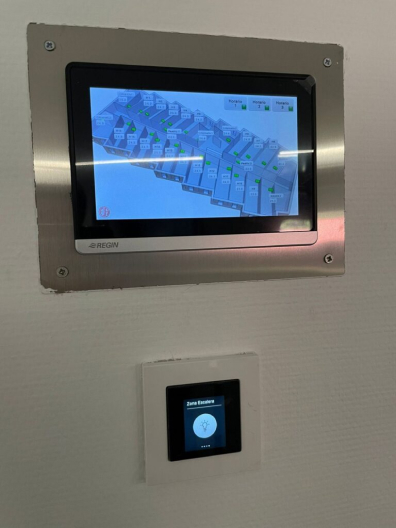 Los elementos de cuadro son del fabricante SCHNEIDER ELECTRIC “pasarelas knx-dali, servidor WiserLynk y actuadores binarios”, así como los elementos de campo “detectores, pulsadores y Multitouch”.La programación ha constado de integrar los protocolos estándar KNX y Dali, para poder crear escenas y grupos de encendidos, según necesidades de la propia instalación.